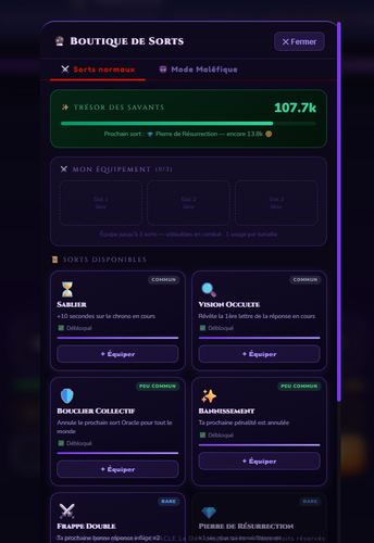 - 🛡️ Sorts communautaires — débloquez ensemble des boucliers et contre-attaques