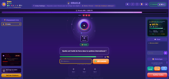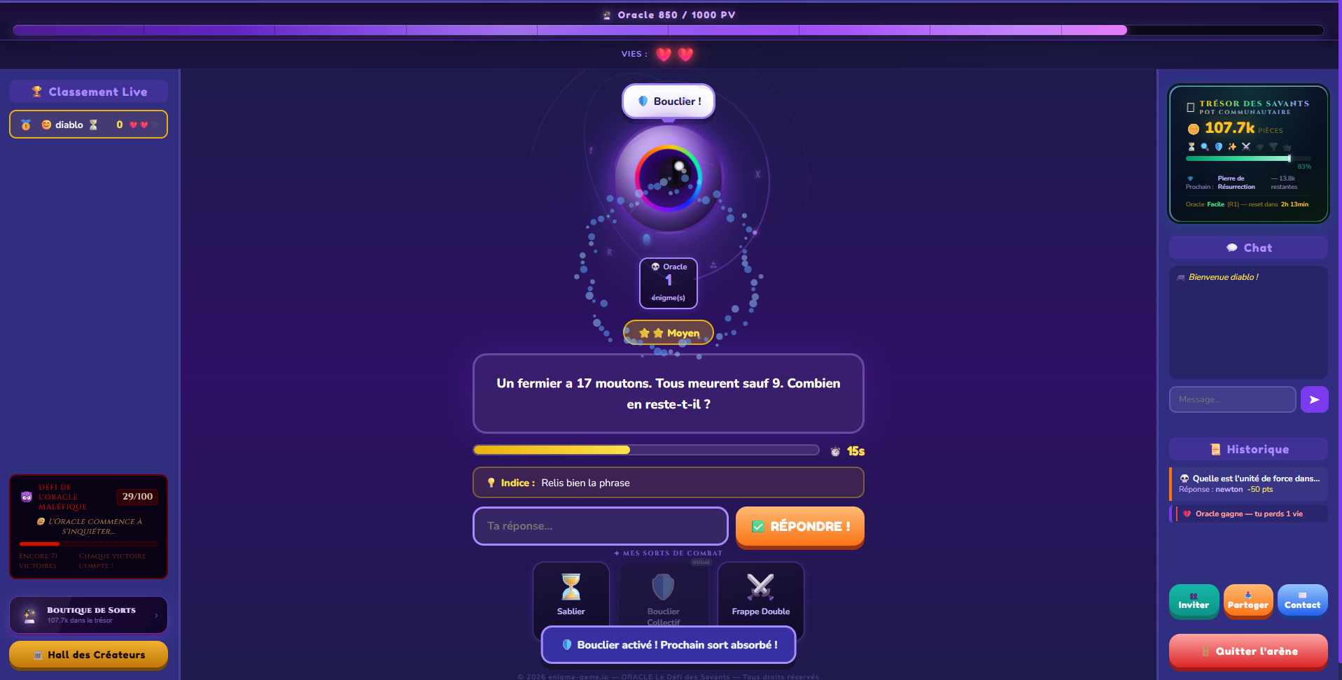 Chaque question est une course contre la montre. Répondez avant l'Oracle pour lui infliger des dégâts. Trop prêt ? Tu perds une vie. 0 vie = éliminé.