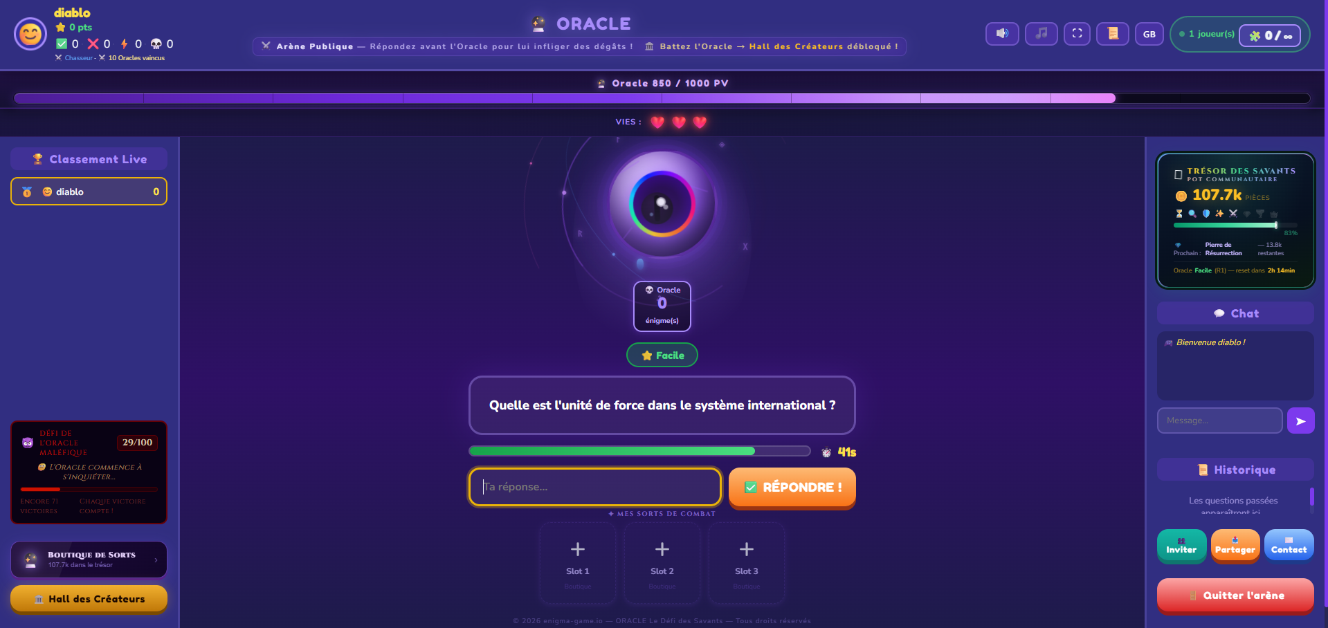 Comment jouer Entre ton pseudo, rejoint l'arène et répond aux questions le plus vite possible. Chaque bonne réponse inflige des dégâts à l'Oracle. Tous les joueurs combattent ensemble pour réduire sa barre de vie à zéro.